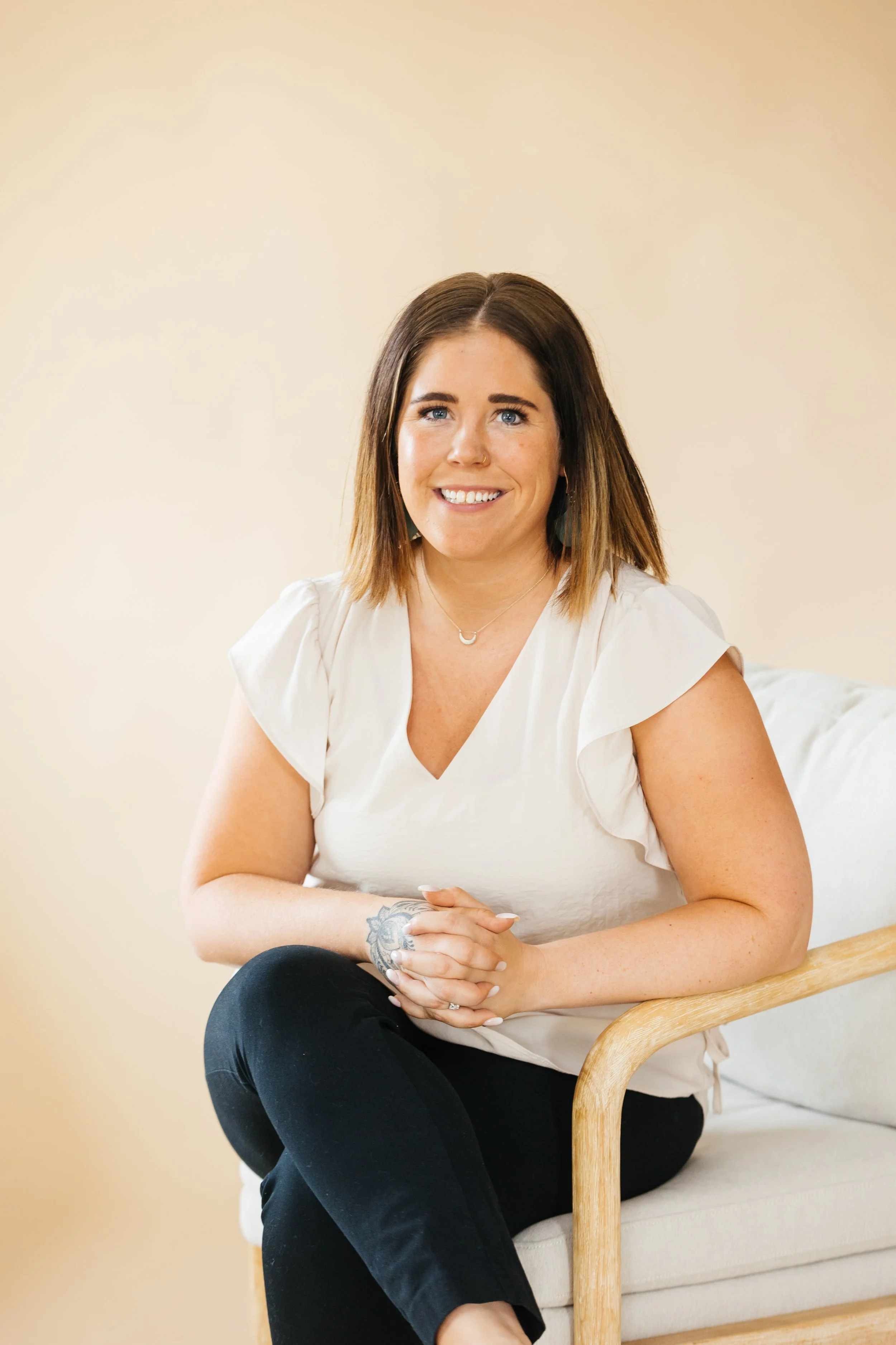 • A woman with shoulder-length brown hair, wearing a white top and black pants, sitting on a beige couch with wooden arms, smiling and looking at the camera.
